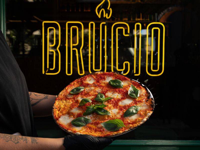 Proprio la pizza è il fiore all'occhiello di Brucio. Dalle classiche bianche e rosse a quelle che ruotano ogni 4-5 mesi, tutte guarnite da topping cucinati con tecniche moderne (come sottovuoto e CBT) senza stravolgere il gusto a cui i clienti sono abituati. A guidare le operazioni è il pizzaiolo Alessandro Petrolà che firma una tonda romana realizzata a partire da un impasto che lievita e matura per complessive 96 ore restituendo una pizza leggera, digeribile e croccante. Tra le specialità della nuova sede, la pizza con Pollo e peperoni (con base di peperone arrosto e pomodoro cuore di bue, petto di pollo CBT sottile, gel di peperone e peperone crusco in cialde) e quella Vegana a colori (con patate viola in crema e croccanti, caponata, pomodorino giallo e rosso semi dry). A queste referenze, infine, si aggiunge la vera novità della sede di Prati: la pizza al taglio. Disponibile dalle 9:00 alle 18:00 in uno spazio adiacente al locale principale, è realizzata dal pizzaiolo Marco Di Pinto e rappresenta la soluzione ideale per colazioni, pranzi veloci, take away e delivery (magari insieme ai fritti tipici, calzoni e pizza ripiena).