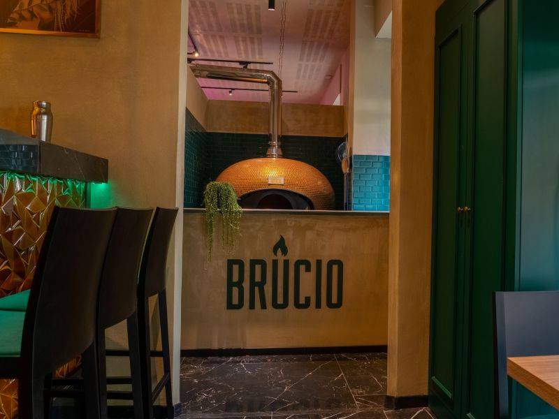 A caratterizzare la proposta gastronomica dell'insegna è la cucina dello chef Antonio Romano, già alla guida della brigata di piazza delle Coppelle. Per quanto riguarda il menu del ristorante, spazio ai sapori della tradizione, con alcune novità stagionali. Non mancano i primi piatti tipici (carbonara, amatriciana, gricia e cacio e pepe), ma c’è spazio anche per taglieri di salumi e formaggi, frittura di calamari e gamberi, tagliata con patate. Sapori da gustare in un punto vendita che occuapa 300 mq per una capienza di 150 coperti tra interno ed esterno, spicca l'arredamento ricercato con predominanza di velluto verde, dettagli dorati, pavimenti in marmo e soffitti alti, arricchiti da lampadari moderni e un'impostazione interna studiata per ospitare l'aperitivo "alla romana". Un layout che fra da trait d'unione con le altre due sedi di Brucio e si distribuisce in tre sale dedicate al ristorante, compreso un salottino privè per eventi esclusivi. A queste aree si aggiunge lo spazioso angolo bar e la zona pizzeria.